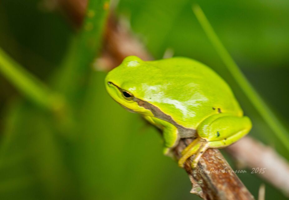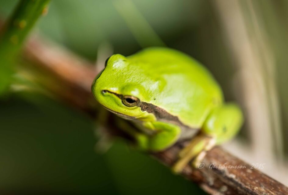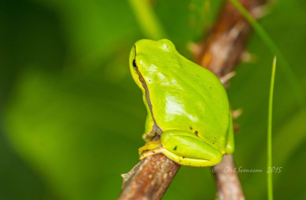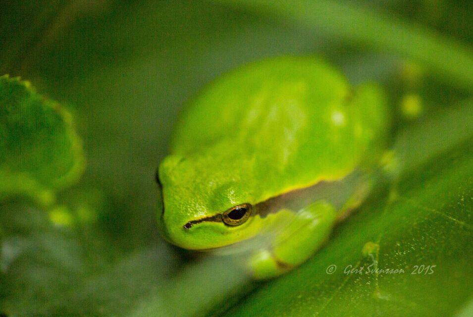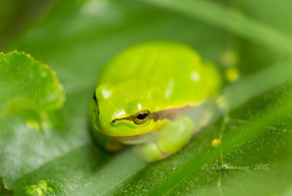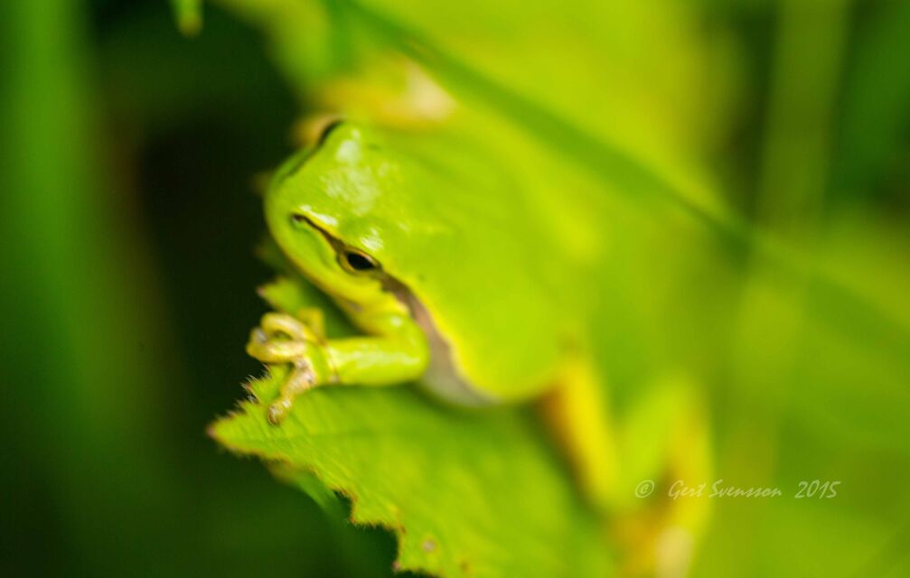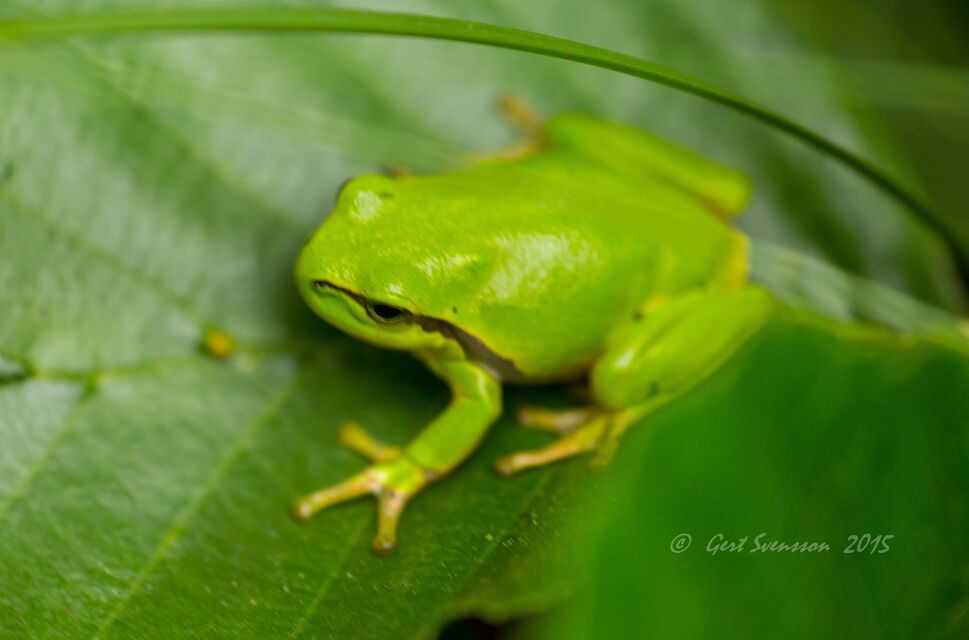 Lövgrodan är 5 cm och sitter på blad och äter insekter